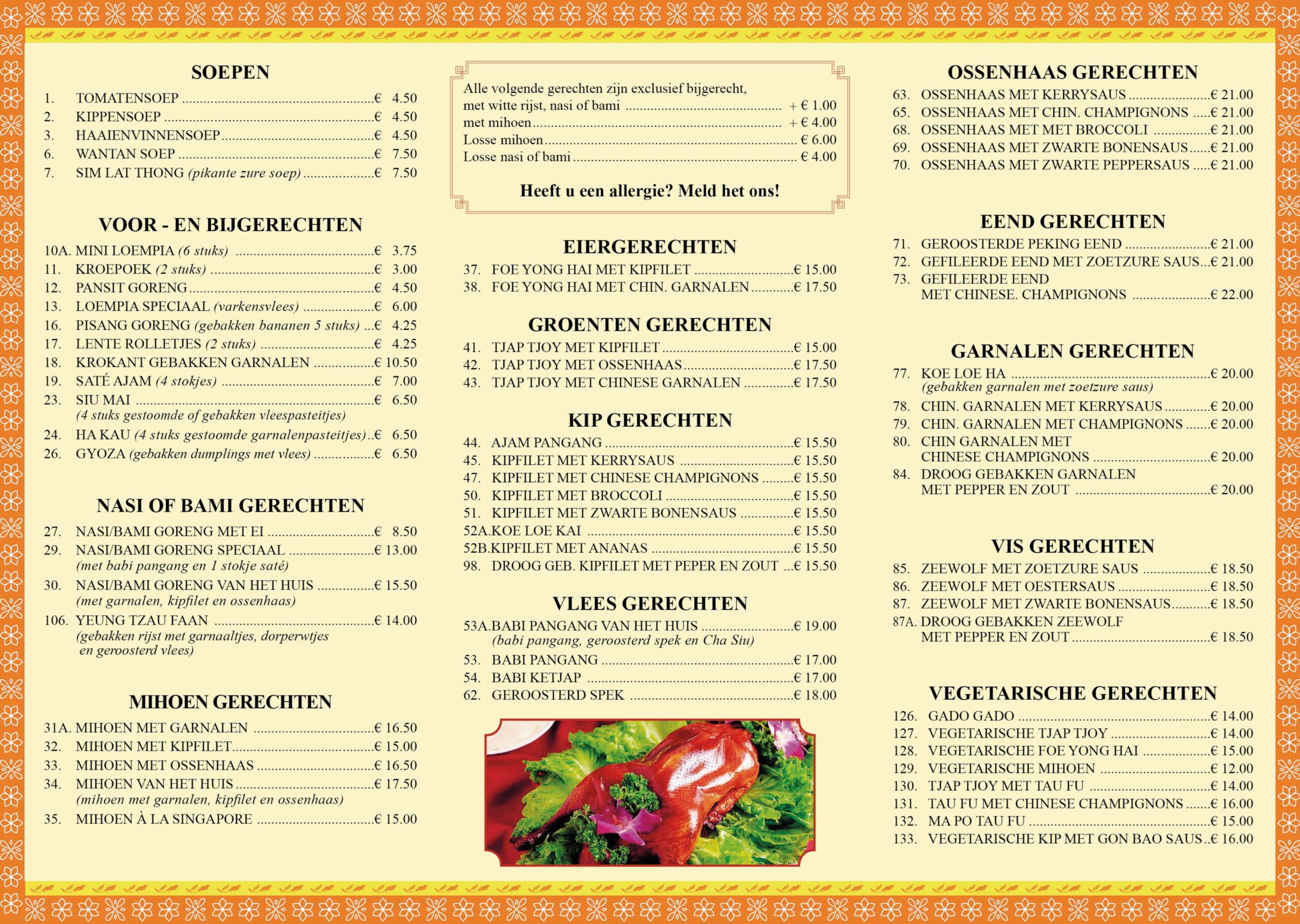 NAAST DE REGULIERE MENUKAART IN ONS RESTAURANT, HEBBEN WIJ OOK SPECIALE GERECHTEN BUITEN DE KAART OM. DIT ZIJN GERECHTEN ZOALS: KREEFT, ZEEBAARS, TARBOT, BIEFSTUK, LAMSRACK EN DONGPO-VARKENSVLEES. OM ZEKERHEID TE BIEDEN DAT WIJ DEZE GERECHTEN IN HUIS HEBBEN, VRAGEN WIJ U OOK OM ONS VAN TE VOREN TE LATEN WETEN DAT U ÉÉN OF MEERDERE VAN DEZE GERECHTEN WILT BESTELLEN.